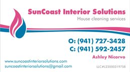 At SunCoast Interior Solutions LLC, we are committed to providing our clients with the highest level of house cleaning services. I am an experienced professional who is dedicated to delivering exceptional results every time. I use only eco-friendly products and practices to ensure the safety of our clients and the environment. Now offering home watch service, in my home pet sitting.